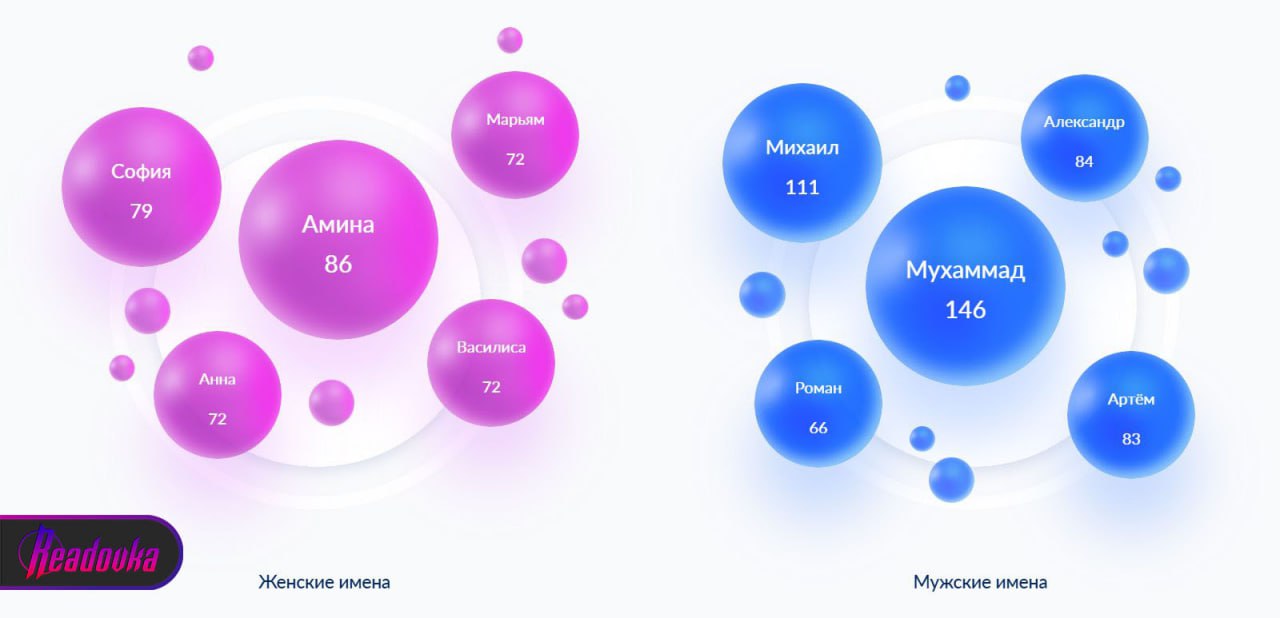 У девочек в топе по-прежнему остается Амина — за 3 месяца так назвали еще 47 малышек. В начале года Амина потеснила на пьедестале женских имен Софию — сейчас между ними разрыв в 7 новорожденных. В целом по России среди мальчиков наиболее популярны Михаил, Александр и Артем. Девочек чаще всего называют Софиями, Евами и Аннами.