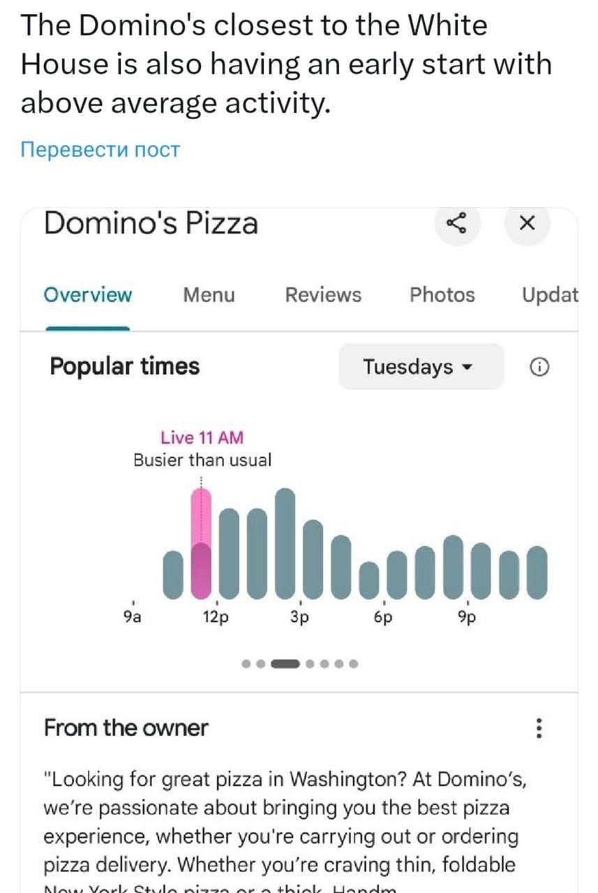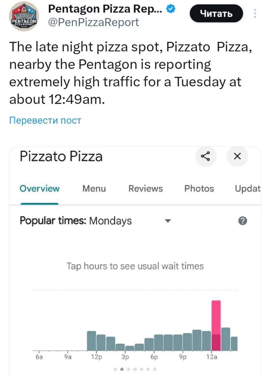 Количество заказов пиццы рядом с Пентагоном и Белым домом в очередной раз взлетело поздней ночью. Пользователи соцсетей опасаются, что верхушка США тщательно продумывает массированную бомбардировку Ирана.