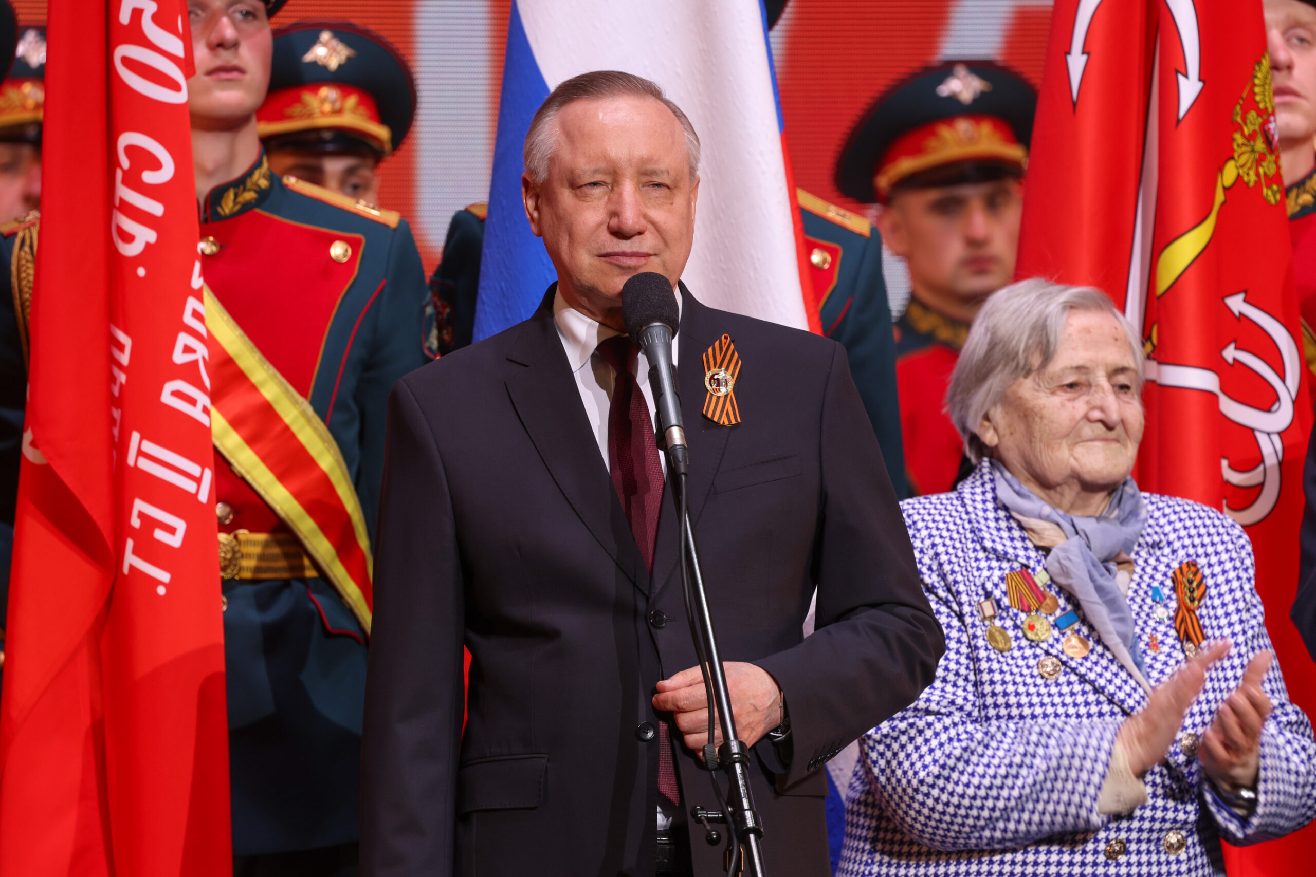 Собравшихся в зале зрителей — ветеранов Великой Отечественной войны, блокадников, в том числе прибывших из-за рубежа и с новых территорий России, а также участников специальной военной операции с наступающим всенародным праздником поздравили губернатор Александр Беглов, председатель Законодательного Собрания Санкт-Петербурга Александр Бельский, заместитель полномочного представителя Президента Российской Федерации в Северо-Западном федеральном округе Роман Балашов, исполняющий обязанности командующего войсками Ленинградского военного округа Рустам Миннекаев, а также председатель Санкт-Петербургской общественной организации «Жители блокадного Ленинграда» Елена Тихомирова.