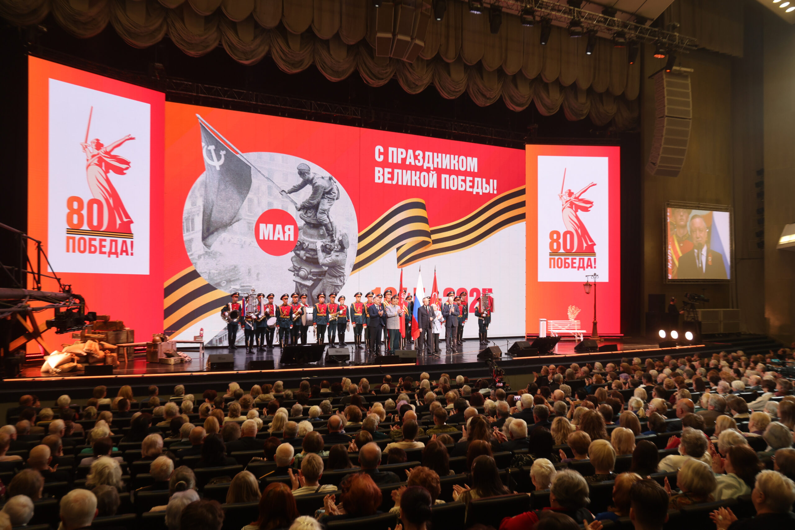 «Ленинградцы, петербуржцы, дорогие ветераны, блокадники, дети войны! С праздником, с Днём нашей Великой Победы! Нас отделяет буквально несколько часов от того момента, когда 80 лет назад был подписан акт о капитуляции фашистской Германии. Была поставлена точка в самой страшной, самой кровавой, но и в самой народной войне, в которой наш народ победил», – обратился к залу Александр Беглов.