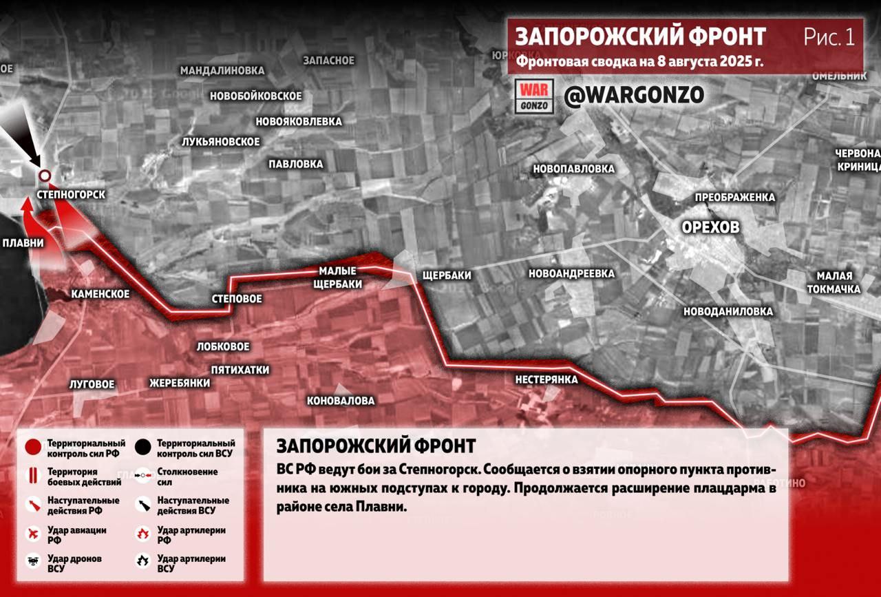 Запорожский фронт. ВС РФ ведут бои за Степногорск. Сообщается о взятии опорного пункта противника на южных подступах к городу. Продолжается расширение плацдарма в районе села Плавни. (Рис. 1)
