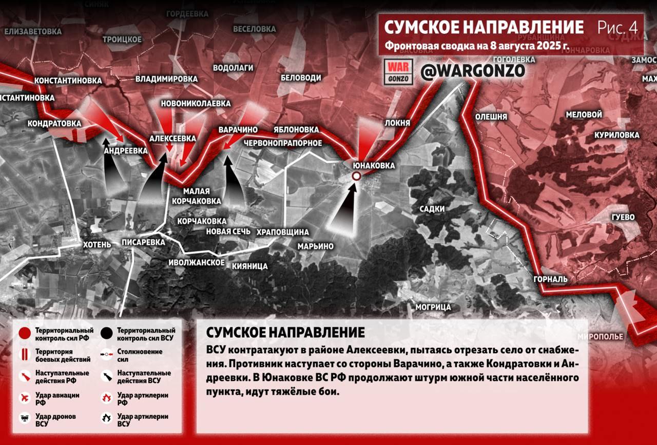 Сумское направление. ВСУ контратакуют в районе Алексеевки, пытаясь отрезать село от снабжения. Противник наступает со стороны Варачино, а также Кондратовки и Андреевки. В Юнаковке ВС РФ продолжают штурм южной части населённого пункта, идут тяжёлые бои. (Рис. 4)
