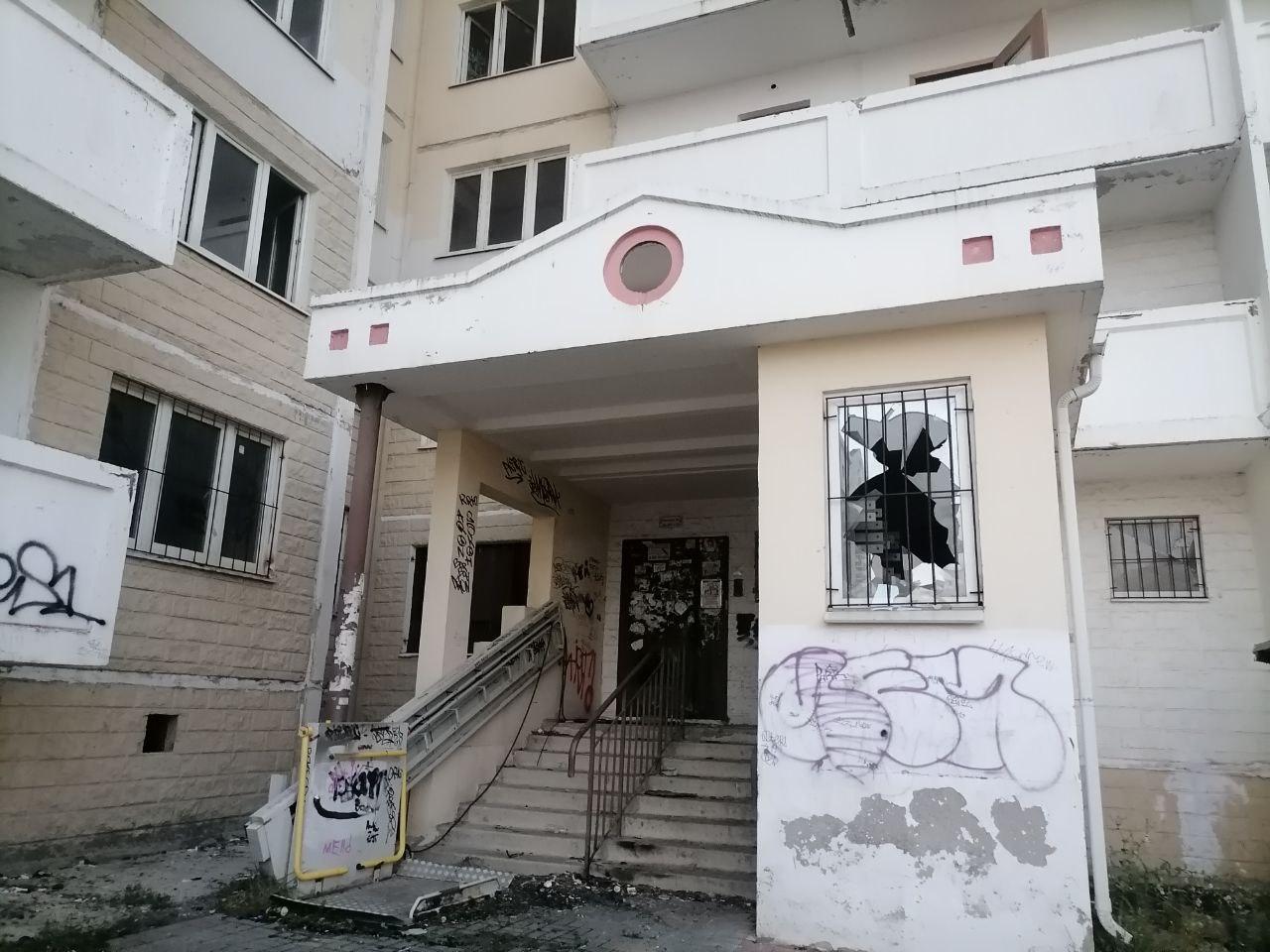 Здание пустует, стекла и двери местами выбиты