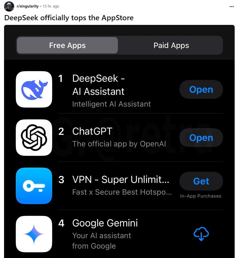 Теперь чат-бот DeepSeek стал самым популярным приложением в американском AppStore.