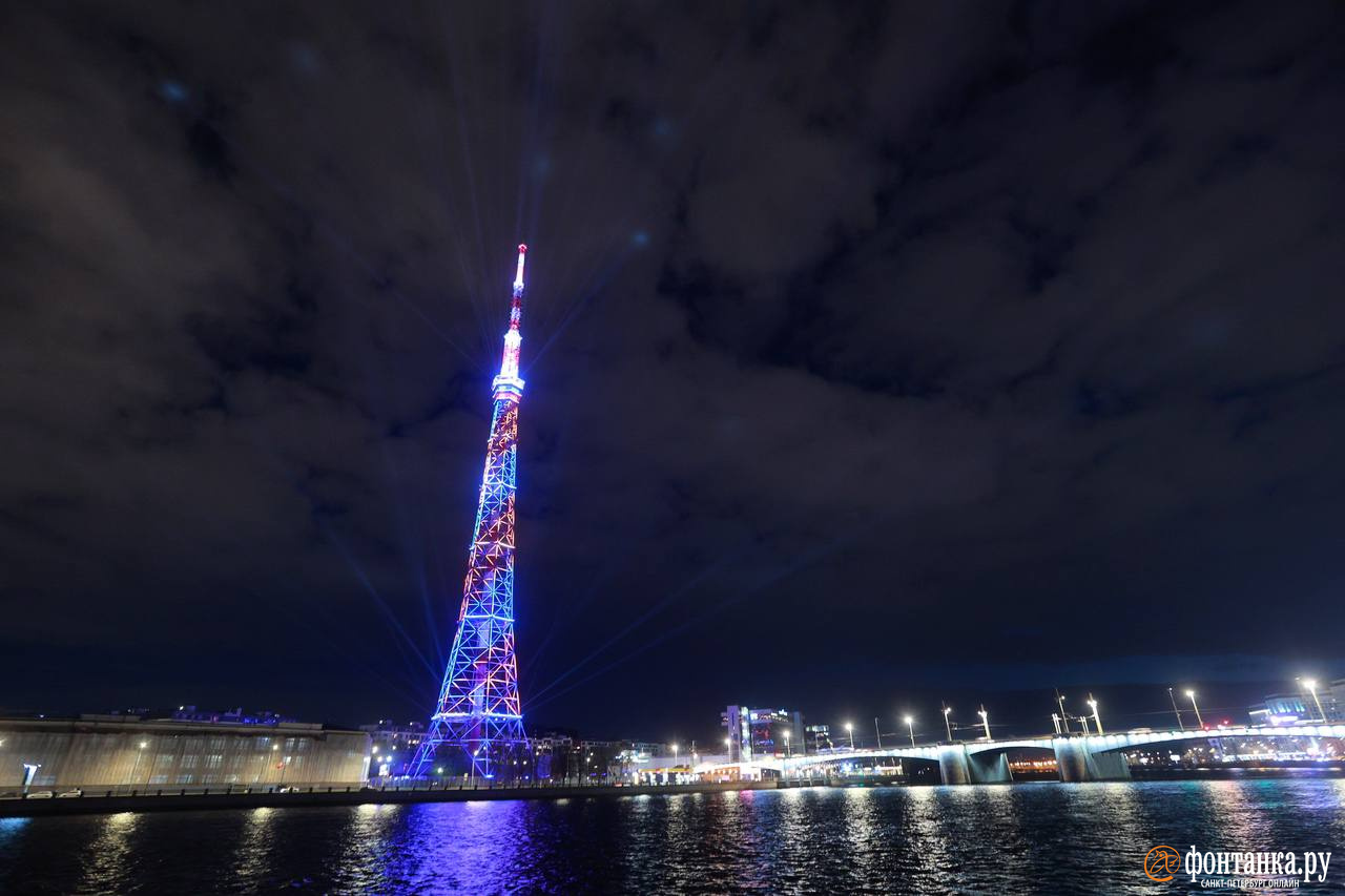 В честь дня Победы телебашня в Петербурге запустила «салюты» и окрасилась в георгиевскую ленту