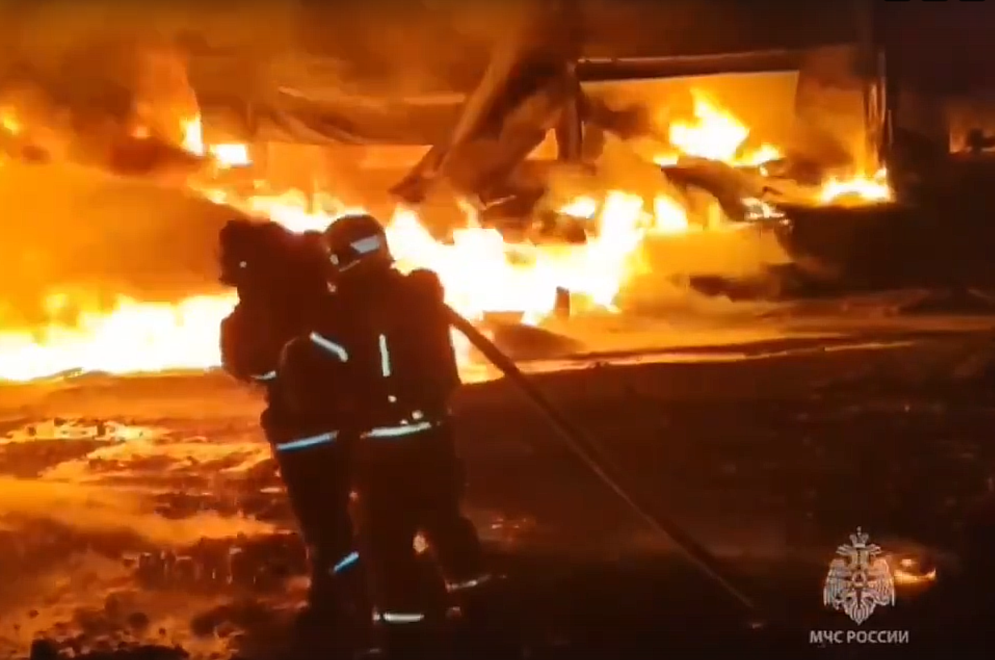 Сообщается, что тушение огня усложняет высокая пожарная загрузка здания, внутри находятся бочки с моторным маслом.