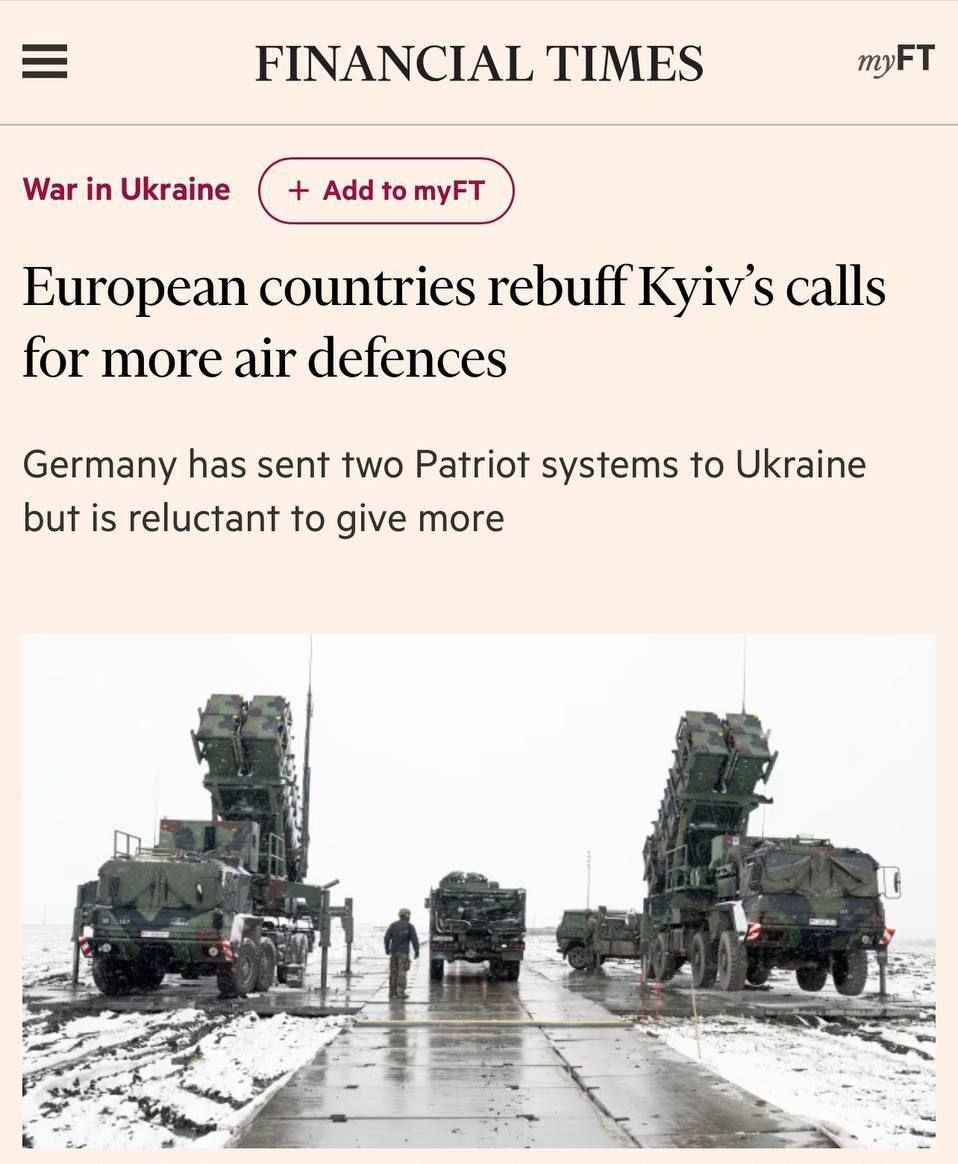 Financial Times пишет что ряд европейских стран отказался предоставить Украине свои системы ПВО. По данным издания Киев запросил у Польши, Румынии и Испании Patriot, но получила отказ. Руководство этих стран ответило, что опасается за свой собственный оборонный потенциал и поэтому делиться не может. Постоянные отказы и затяжка времени в предоставлении помощи крайне негативно влияют на психологическое состояние украинских элит и общества.