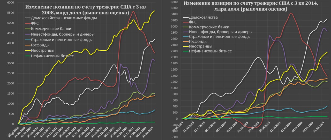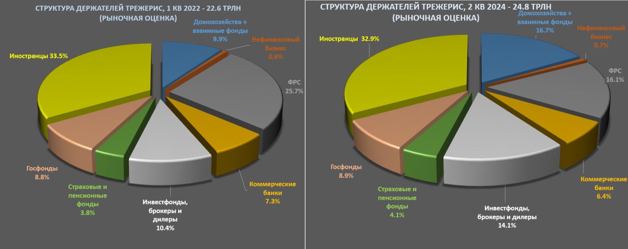 По объему концентрации трежерис на балансе, основные держатели – ФРС и нерезиденты, но ключевые держатели утрачивают позиции (чистые продажи и/или более медленные темпы наращивания активов в трежерис относительно скорости аккумуляции совокупных обязательств в трежерис).