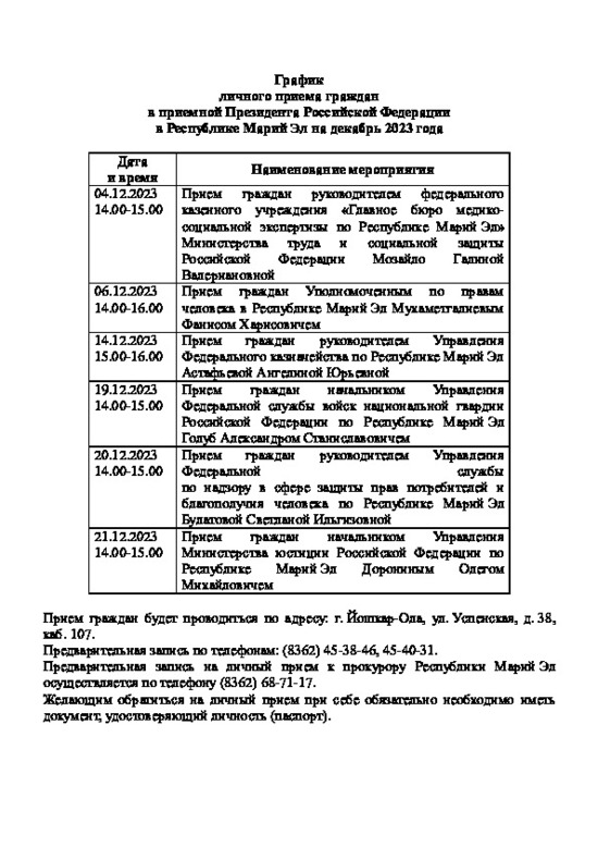 В декабре в приемной Президента РФ Марий Эл пройдут приемы граждан