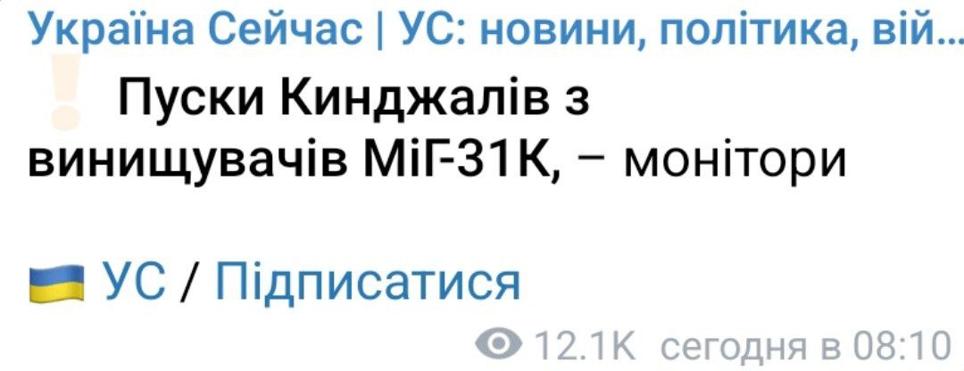 На всей территории Украины звучит воздушная тревога на фоне информации о взлёте десятков стратегических ракетоносцев Ту-95МС и носителей гиперзвуковых "Кинжалов" МиГ-31К(И).