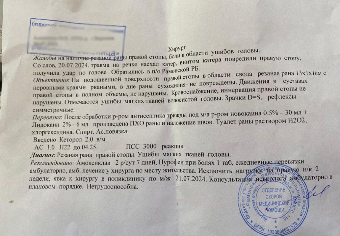 — На правой стопе — рваная рана и кровь хлещет ручьём, винтом ногу распороло или днищем катера — сказать не могу. Сразу соседи набрали 112 и начали мне оказывать первую помощь. Прошло минут 10 — 15, я ещё лежала на мостке, где мне обрабатывали рану, тот же катер плывёт обратно мимо нас. Соседи начали фотографировать его, кричать и жестикулировать: «Плыви сюда! Смотри, что ты наделал...». Но судно пролетело мимо нас и скрылось. Скорая, куда позвонили соседи, сказала, что ехать до нас будет долго, и посоветовала добираться до больницы самостоятельно. Соседи привезли меня туда, рану на ноге зашили и обработали — отделалась только этим да ушибом мягких тканей головы. Врач расспросила меня об обстоятельствах случившегося и о том, буду ли я писать заявление в полицию, я сказала, что, конечно, буду. После всего этого сосед отвёз меня обратно на мою дачу, знакомые рассказали, что, когда я была в больнице, на катере приезжали сотрудники ГИМСа, покрутились на месте происшествия, но даже не вышли на берег.