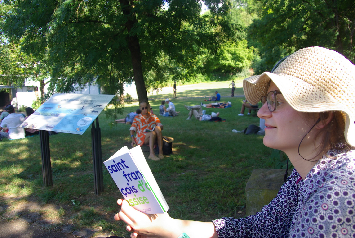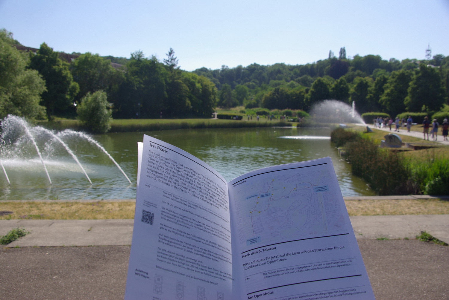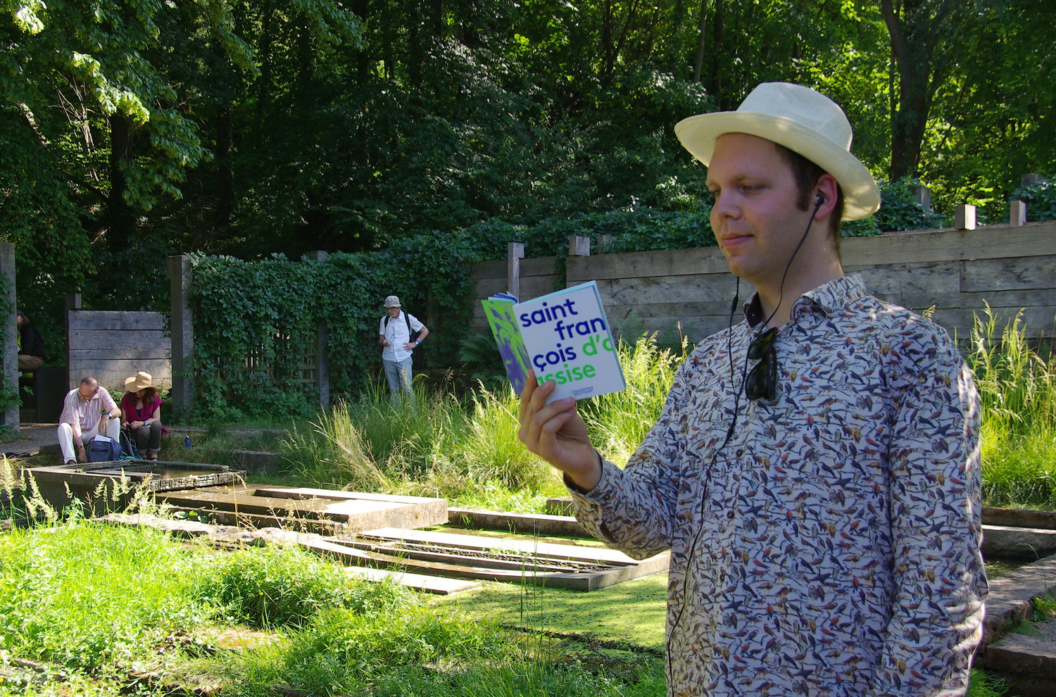 Далее началось паломничество: группы, сопровождаемые гидами, добрались на метро до парка, где всем объяснили маршрут и раздали плееры с наушниками. Четвертую картину, «Ангел-путешественник», мы прослушали в записи, а вся оперная труппа тем временем переместилась в амфитеатр. К этой концертной площадке и простирался наш путь – мимо прудов с фонтанами, садов с цветами и лесными аллеями – сопровождаемый волшебной музыкой четвертой картины. На лужайке около фонтана в виде шара нас поджидал уже знакомый ангел-богомол; его двойник в том же обличии затаился около изгороди сада, а третий сидел в ветвях раскидистого дерева в другой части парка. К ним охотно подходили взрослые и дети, чтобы сделать селфи с ангелом. Пятая картина, «Ангел-музыкант», и шестая картина, «Проповедь птицам», исполнялись на открытой площадке, при этом оркестр и хор, управляемый вторым дирижером Мануэлем Пуйолем, руководителем хора Штутгартской государственной оперы, находились на противоположных концах от сцены. Я едва заметил, как маэстро Титус Энгель в черном плаще с капюшоном прошел к оркестру, и действие началось.