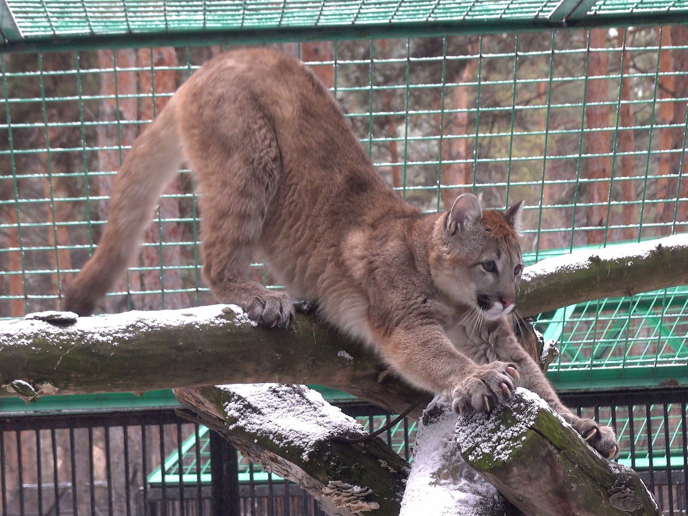 В Новосибирском зоопарке весна заставила многих животных стать активнее и чаще выходить из домиков. Так молодая самочка пумы продемонстрировала, как она легко может перемещаться по дереву.