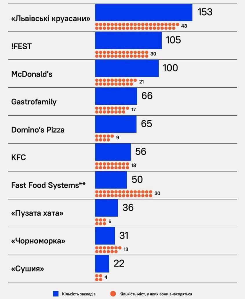 — лидером рынка по количеству заведений в Украине является «Lviv Croissants» со 153 точками, он же является лидером по количеству городов (43)