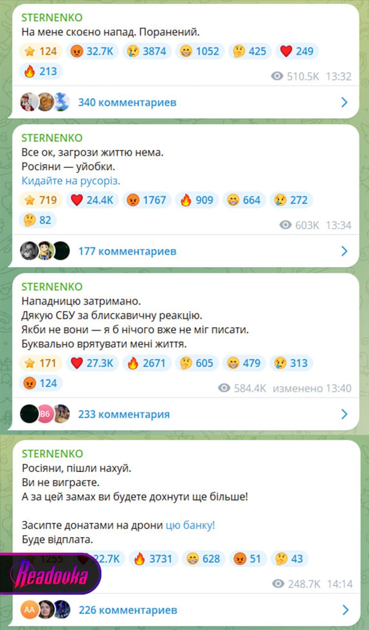 Украинский националист Сергей Стерненко чуть не умер от выстрела «завербованной русскими» женщины — он ранен. Жизни экс-правосека* пока ничего не угрожает. Он уже вышел на связь — попросил ему не писать и объявил сбор ВСУ на «резню русских». Отписался в Telegram буквально через минуту после нападения.