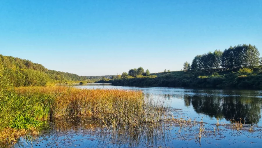 На снимке — умиротворяющий сентябрьский пейзаж. Спокойная гладь воды, словно зеркало, отражает высокое небо и прибрежные деревья. Лето еще не хочет окончательно сдаваться — зелень все еще сочная и густая, но уже кое-где пробиваются первые краски осени: листья начинают медленно желтеть.