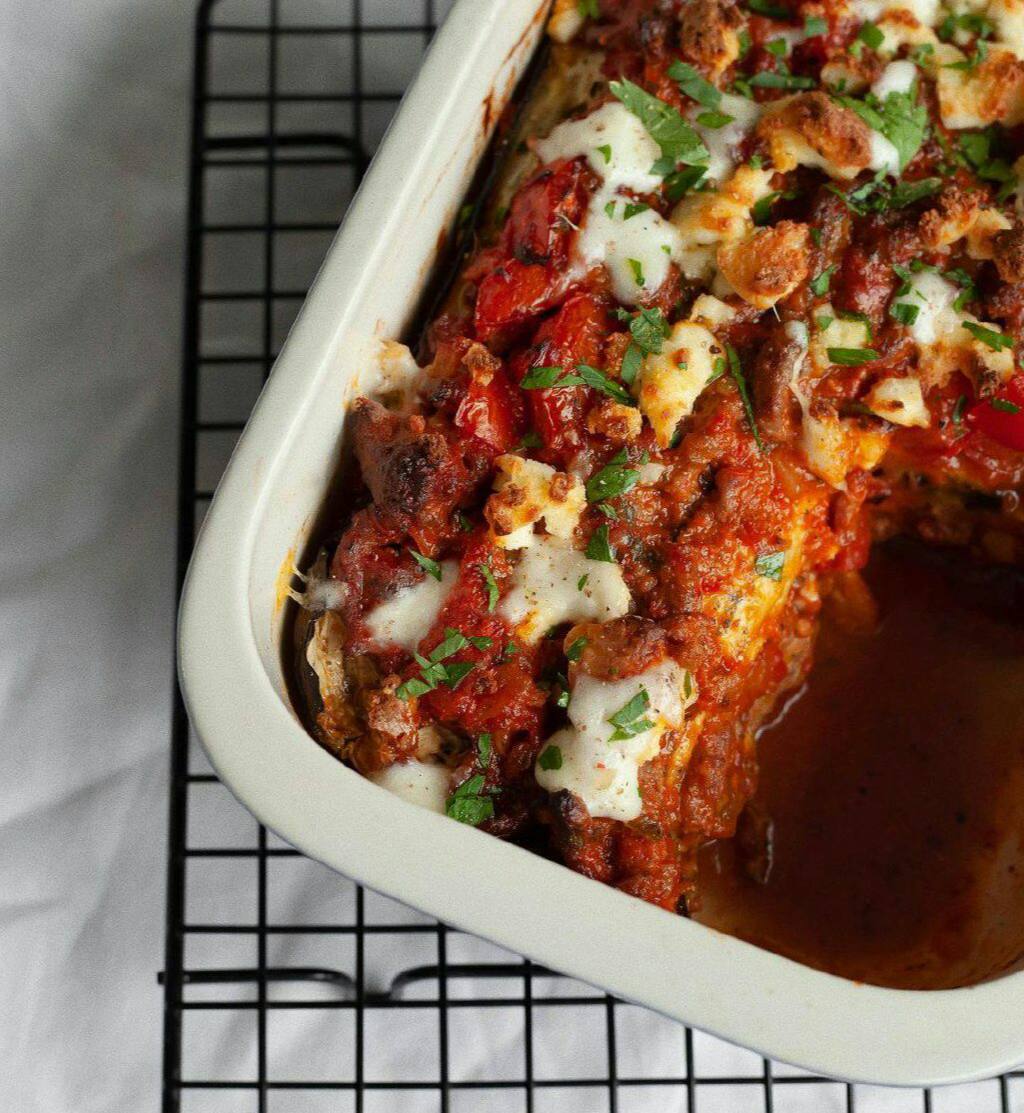 4. Форму смазать маслом растительным и выложить слоями: баклажаны, фарш в томатном соусе и поломанная на мелкие кусочки брынза. И повторяем слои по второму кругу.