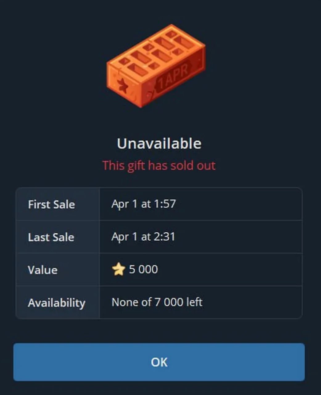 Продажа лимитированных кирпичей началась 1 апреля в 1:57 мск, а уже в 2:31 все 7 тыс. доступных подарков были распроданы. Один кирпич можно было приобрести за 5 тыс. звезд (у владельцев iPhone за 13 690 руб., а на Android — 8229 руб.). Так, на продаже кирпичей Telegram заработал от 58 млн до 95,8 млн руб.