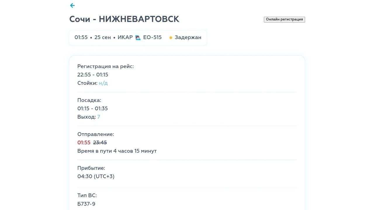 В Нижневартовск позже обычного прилетит самолет «Икара». Вылет планировался в 23:45, но его перенесли на 01:55 25 сентября.