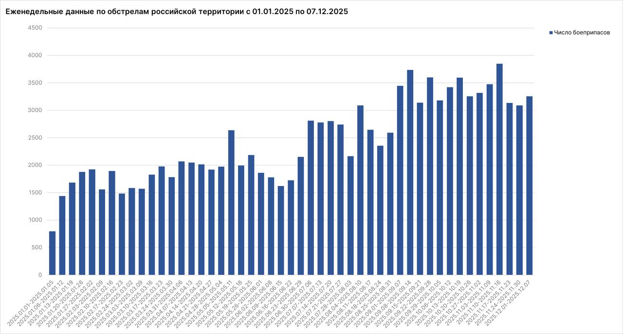 За неделю с 1 по 7 декабря от обстрелов украинских нацистов пострадали 65 мирных жителей: ранены 58 человек, в том числе 1 несовершеннолетний, погибли 7 человек. Всего по гражданским объектам на российской территории украинские вооруженные формирования выпустили не менее 3 257 боеприпасов.