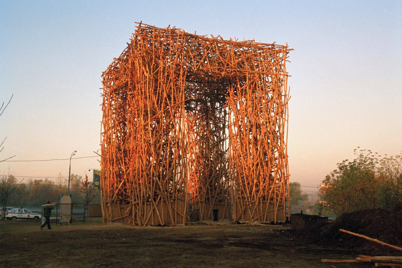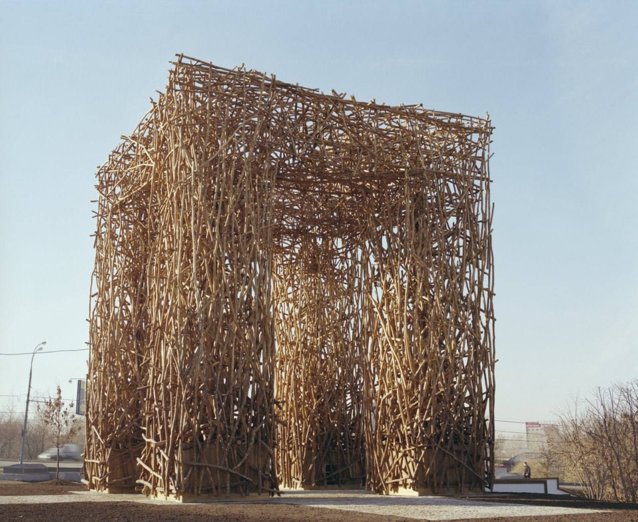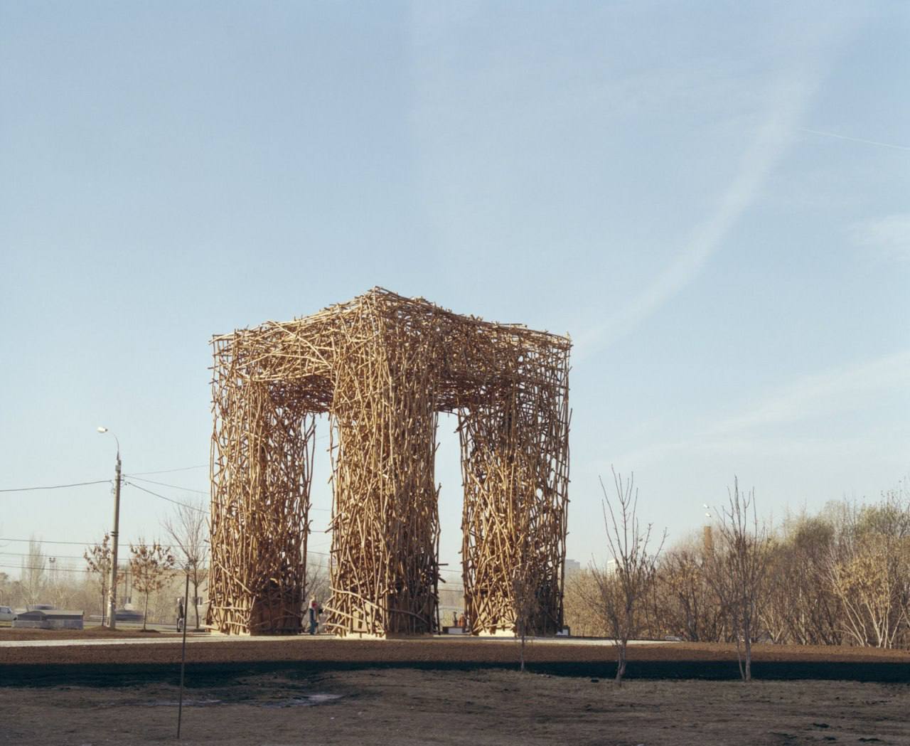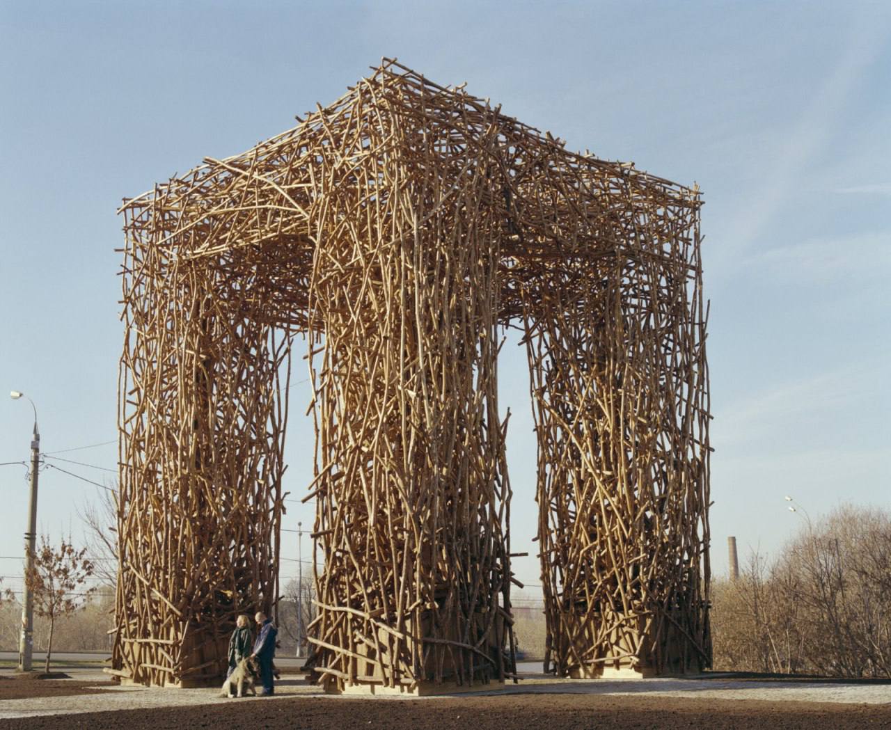 Неподалеку от станции метро Владыкино, художник установил арку из больших веток. Ворота стали порталом из зарегулированного города в свободную природу.
