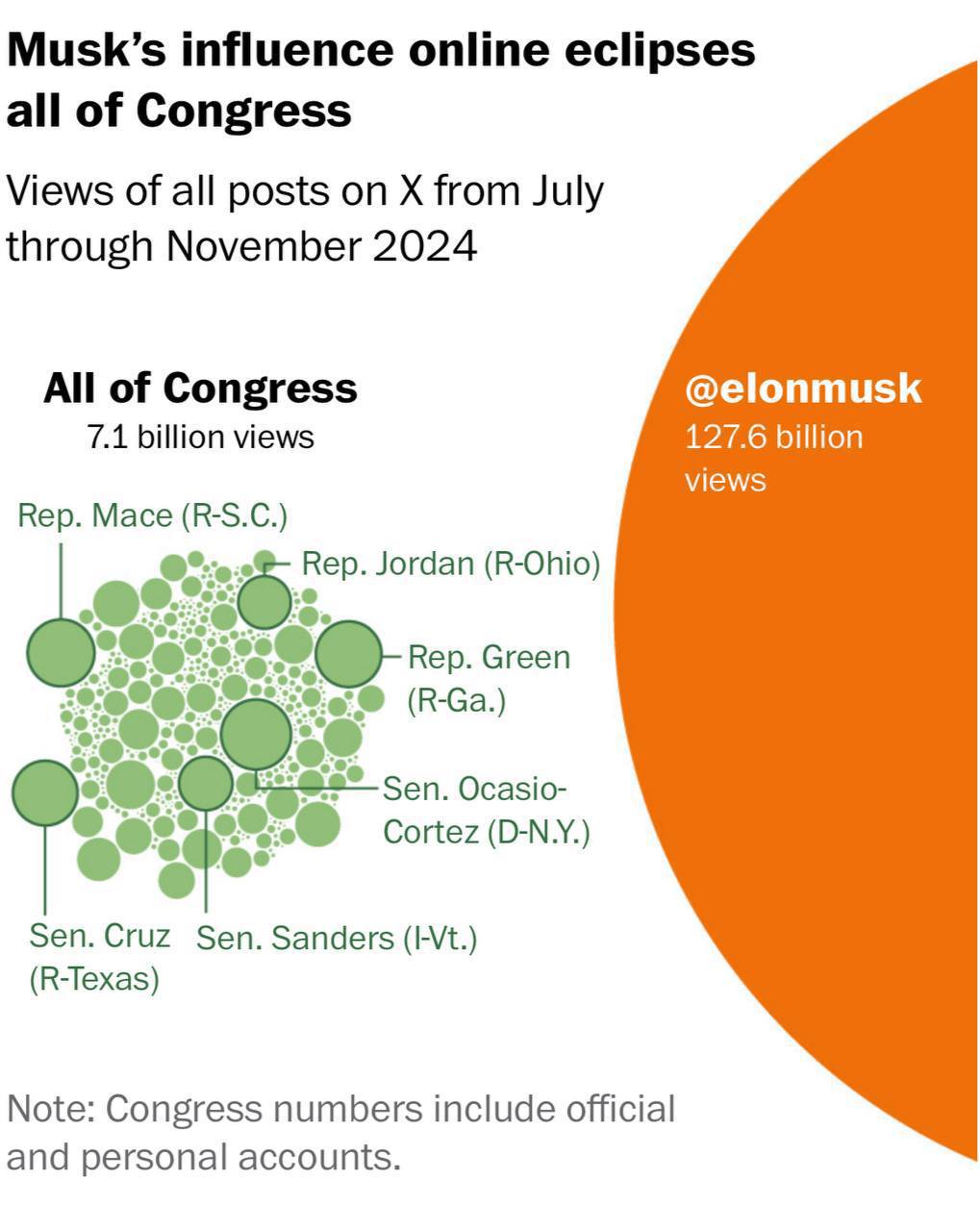 ΠΠΎ ΠΈΠ½ΡΠΎΡΠΌΠ°ΡΠΈΠΈ ΠΈΠ·Π΄Π°Π½ΠΈΡ, Ρ ΠΈΡΠ»Ρ 2024 Π³ΠΎΠ΄Π° ΠΏΡΠ±Π»ΠΈΠΊΠ°ΡΠΈΠΈ ΠΠ»ΠΎΠ½Π° ΠΠ°ΡΠΊΠ° Π² ΡΠΎΡΠΈΠ°Π»ΡΠ½ΠΎΠΉ ΡΠ΅ΡΠΈ X Π½Π°Π±ΡΠ°Π»ΠΈ 133 ΠΌΠ»ΡΠ΄ ΠΏΡΠΎΡΠΌΠΎΡΡΠΎΠ² β Π² 15 ΡΠ°Π· Π±ΠΎΠ»ΡΡΠ΅, ΡΠ΅ΠΌ Ρ Π’ΡΠ°ΠΌΠΏΠ°, ΠΈ Π² 16 ΡΠ°Π· Π±ΠΎΠ»ΡΡΠ΅, ΡΠ΅ΠΌ ΡΡΠΌΠΌΠ°ΡΠ½ΡΠΉ ΠΎΡ Π²Π°Ρ Π°ΠΊΠΊΠ°ΡΠ½ΡΠΎΠ² Π½ΠΎΠ²ΠΎΠ³ΠΎ ΡΠΎΡΡΠ°Π²Π° ΠΠΎΠ½Π³ΡΠ΅ΡΡΠ°.