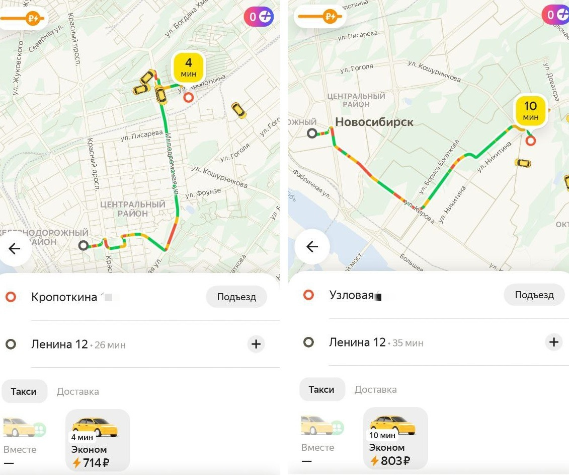 По данным на 8:20 утра, цена на поездку от улицы Узловой до Ленина составляет 803 рубля, хотя в 6 утра составляла 631 рубль. Добраться от площади Маркса до центра можно за 658 рублей. От улицы Кропоткина — 714 рублей, хотя нередко удается поймать машину за 300–400 рублей. Такси от Центрального рынка будет стоить 405 рублей.