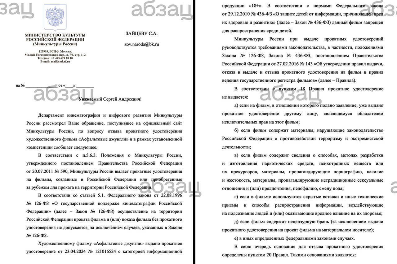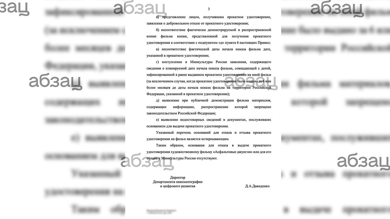 Однако, по мнению министерства, причин для отзыва прокатного удостоверения у «Асфальтовых джунглей» нет. В распоряжении «Абзаца» оказался официальный ответ департамента, из которого следует, что картина не нарушает закон.