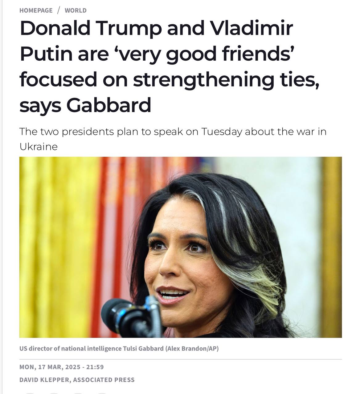 С подачи Associated Press многие западные СМИ сегодня распространили заявление главы национальной разведки США Тулси Габбард о том, что Дональд Трамп и Владимир Путин «являются хорошими друзьями». Сами понимаете, как либералы радостно ухватились за эти слова!