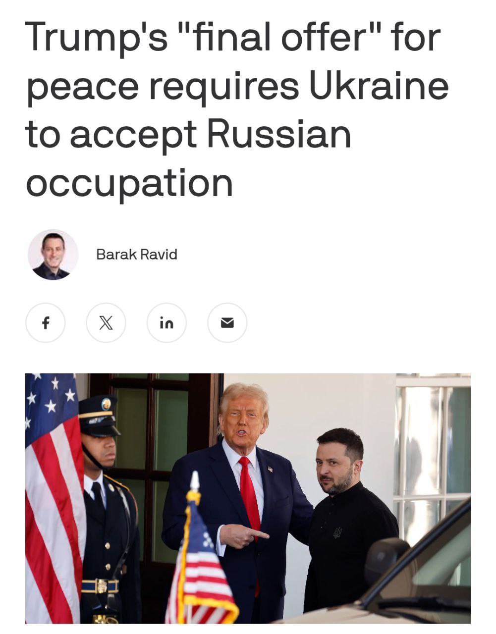 «Одностраничный документ, который США представили украинским чиновникам в Париже на прошлой неделе, описывает это как «окончательное предложение» президента Трампа. Белый дом настаивает на том, что готов выйти из переговоров, если стороны не заключат сделку в ближайшее время», - пишет Axios.