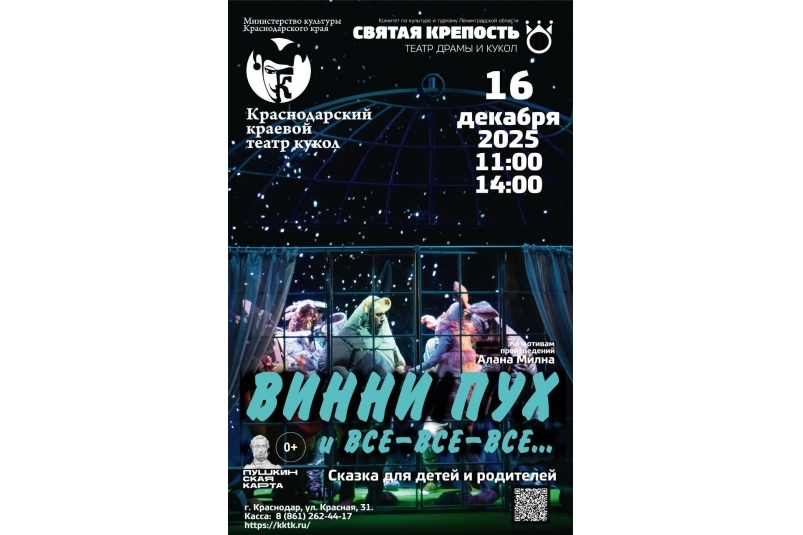 KrasnodarMedia, 21 ноября. Театр драмы и кукол "Святая крепость" из Выборга приедет с гастролями в Краснодарский краевой театр кукол. Зрителей ждут два спектакля: армянская комедия "Ханума" (12+) и детская постановка "Винни Пух и все-все-все" (6+). Показы пройдут 14 и 16 декабря.