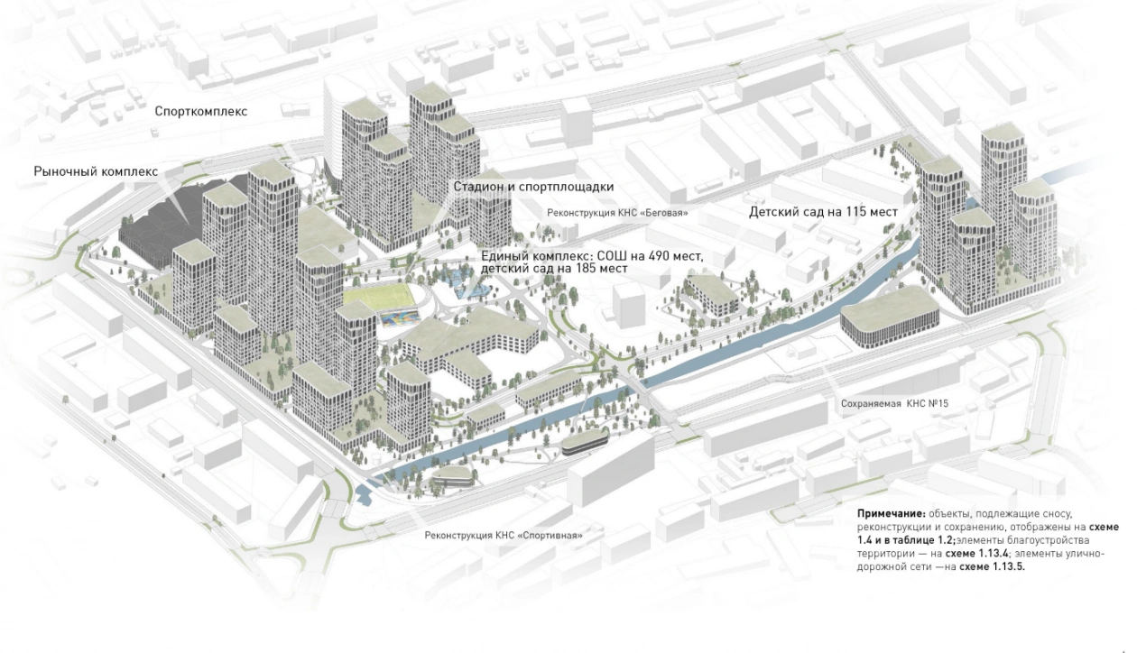Для воплощения этих планов потребуется практически полная расчистка территории. Под снос попадают 32 объекта капитального строительства, включая 27 жилых домов, один из которых — многоквартирный, а также нежилые постройки (автосервис, топливные резервуары и другие). Освободившиеся территории будут разделены на функциональные зоны: 1,19 гектара отдадут под высотные дома, остальные — под сопутствующие объекты социальной, деловой и культурной инфраструктуры.