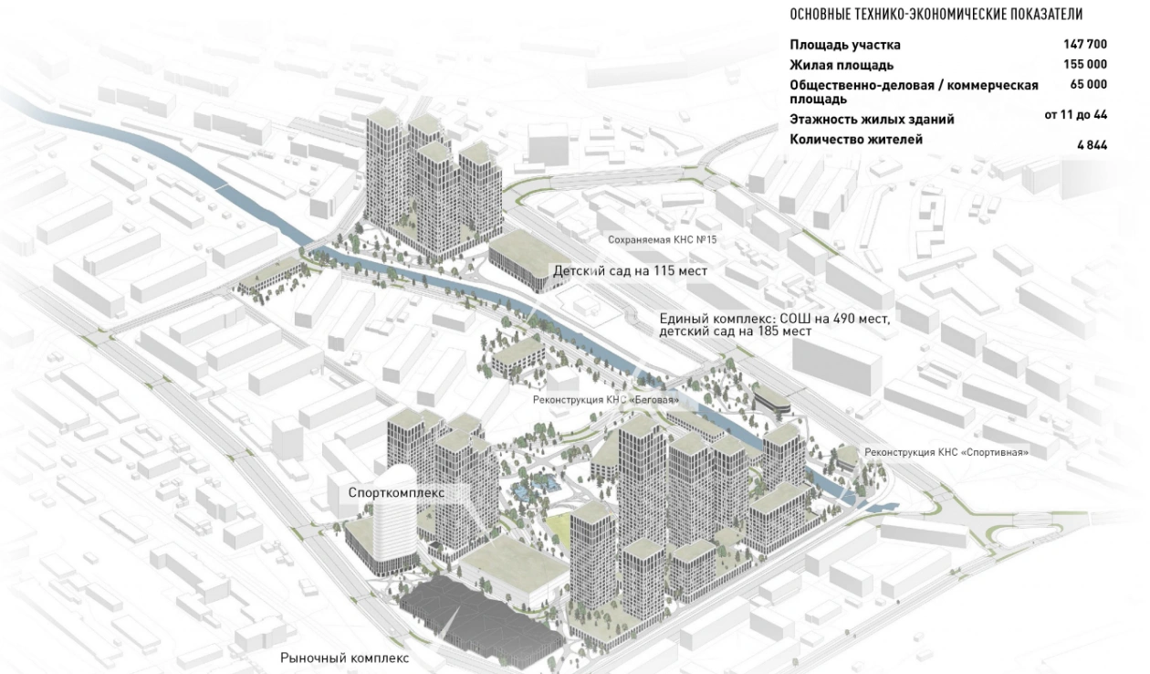Здесь застройщик намерен возвести крупный квартал, включающий торговые площади на 4,8 га, многофункциональный центр, офисные башни суммарной площадью в 2,6 га, гостиницу на 200 номеров, объекты общепита, детский развлекательный центр с упоминанием возможности водного кластера, но не полноценного аквапарка и бытовую инфраструктуру с парковками площадью 2,9 га.