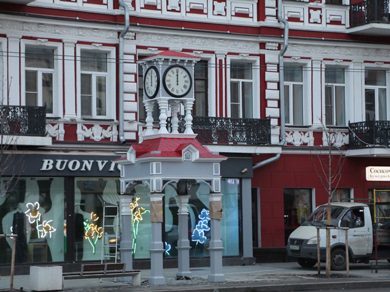 На главной исторической улице Воронежа – проспекте Революции – появилась новая достопримечательность – Михайловские часы. Об их установке сообщил в своём телеграм-канале глава города Сергей Петрин. Современная реплика старинной беседки с часами выполнена не из дерева, как её прототип, а из чугуна на стальном каркасе.