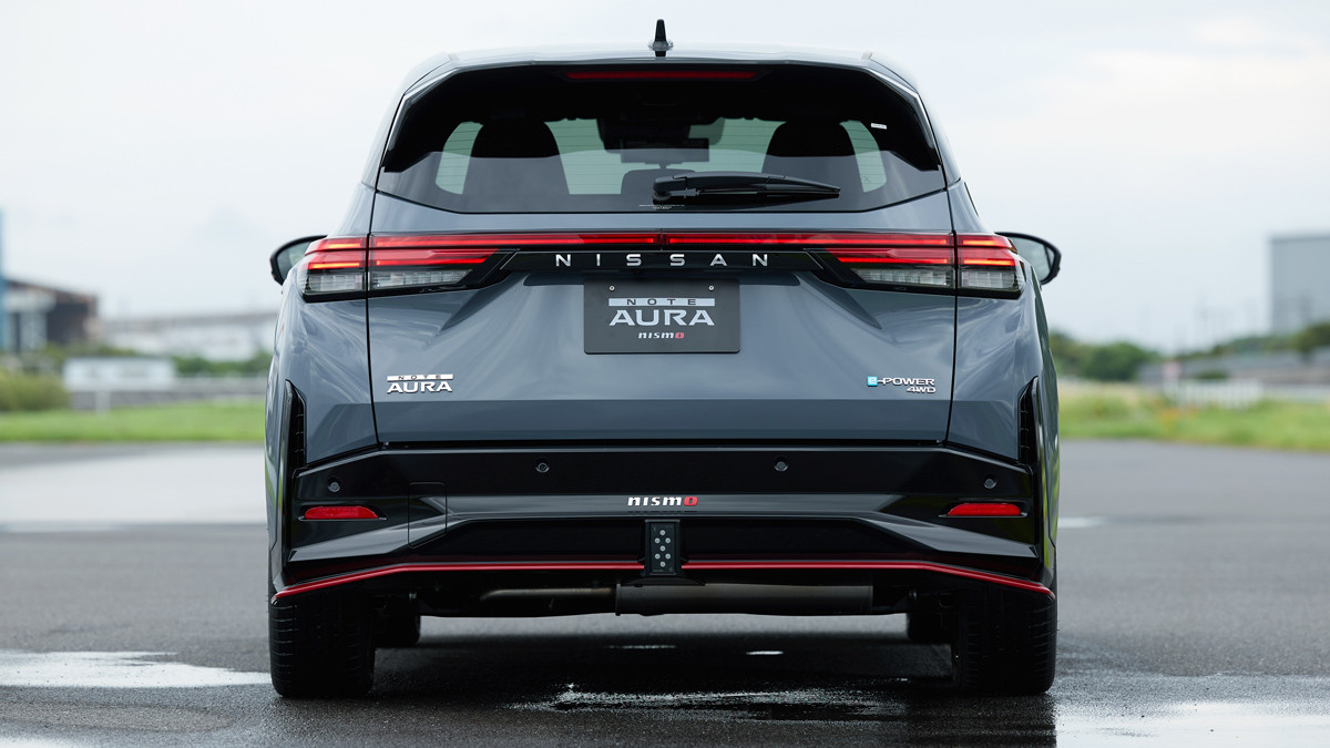 Такой Note Aura снабдили и другим задним бампером. По бокам в нижней части (создана из чёрного глянцевого пластика) у него расположены воздуховоды; ещё его снабдили другим диффузором, который помогает направлять потоки воздуха из-под пола и способствует снижению сопротивления ветра.