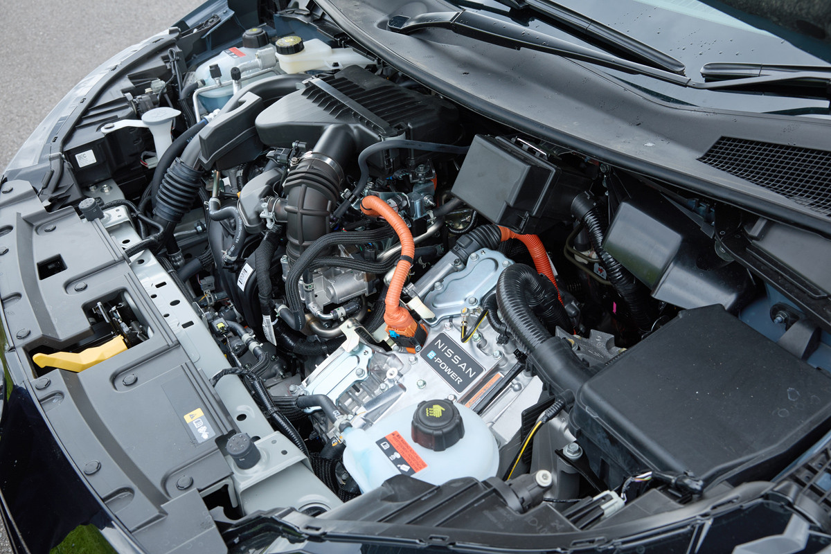 Одним из главных новшеств обновлённой пятидверки является наличие полноприводной версии (у обычного Note Aura 4WD был и до недавнего рестайлинга). Исполнение Nismo e-Power оснащается гибридной установкой последовательного типа, она включает в себя 82-сильный бензиновый двигатель объёмом 1,2 литра (максимальный крутящий момент – 103 Нм), от которого через генератор заряжается литий-ионный аккумулятор, питающий 136-сильный электромотор (300 Нм). У полноприводного варианта в систему входит ещё 82-сильный электродвигатель (150 Нм), расположенный на задней оси; кстати, у обычного хэтчбека его отдача – 68 л.с. и 100 Нм.