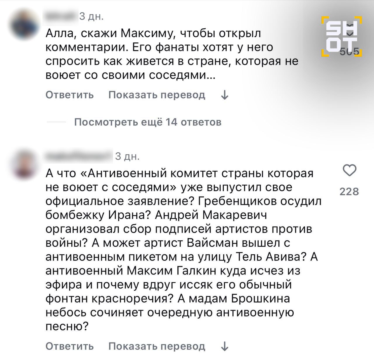 Россияне заспамили комментарии Аллы Пугачёвой и требуют, чтобы она высказалась об атаках Израиля по Ирану. Галкин* предусмотрительно закрыл свои комменты, чтобы избежать волны хейта