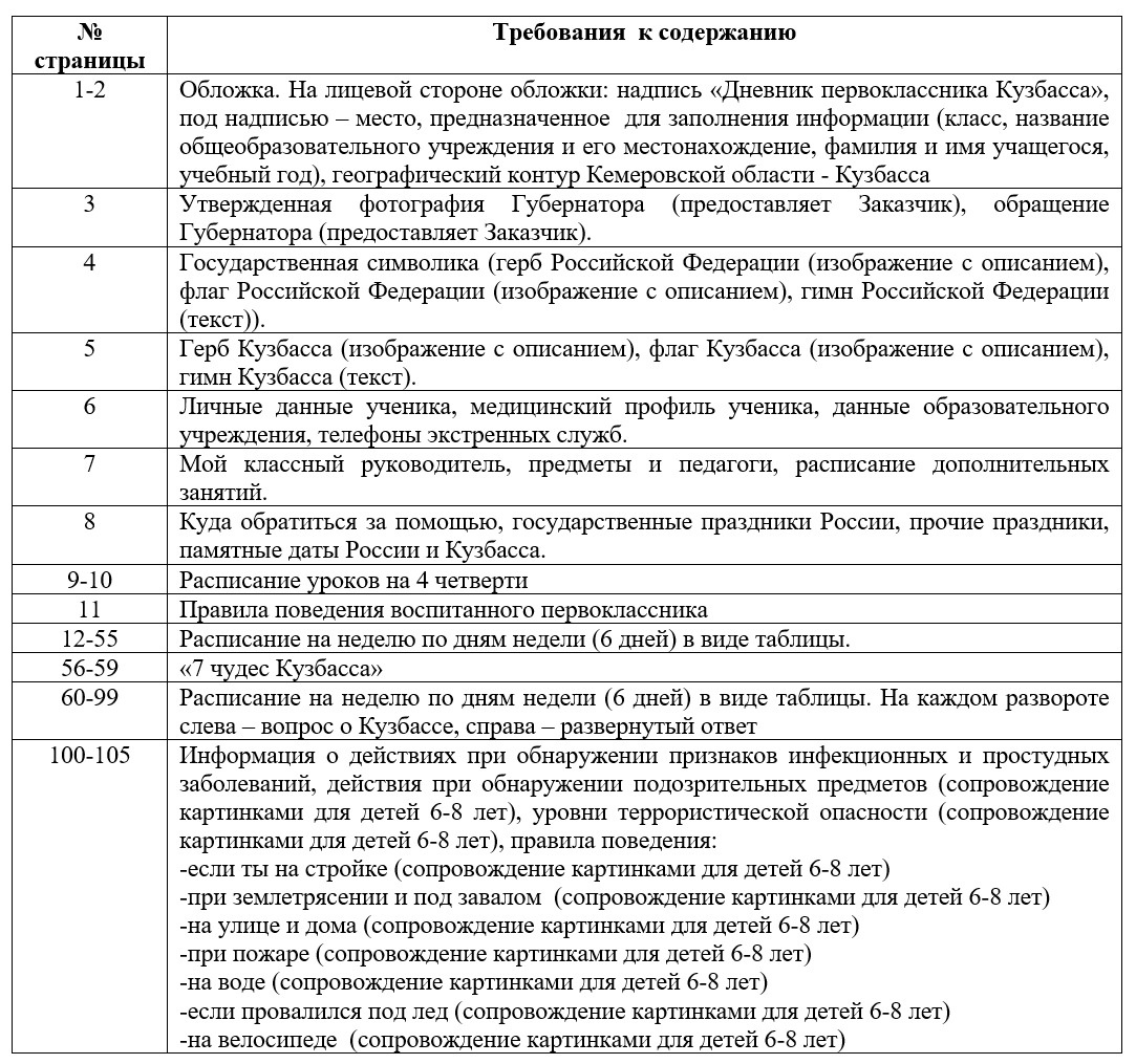 Как следует из технического задания, в дневнике 106 страниц, обложка с обеих сторон выполнена из целлюлозного картона и обработана глянцевым лаком. Помимо традиционных разделов для расписания уроков, в дневнике предусмотрены страницы для фотографии губернатора Кузбасса, символики Кемеровской области и России, данных ученика, правил поведения, интересных фактов о регионе и не только.