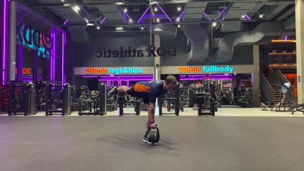 По достижении крайнего положения (тело находится параллельно полу/гиря касается пола) путем сокращения ягодичных мышц левой ноги на выдохе верните себя в исходное положение.
