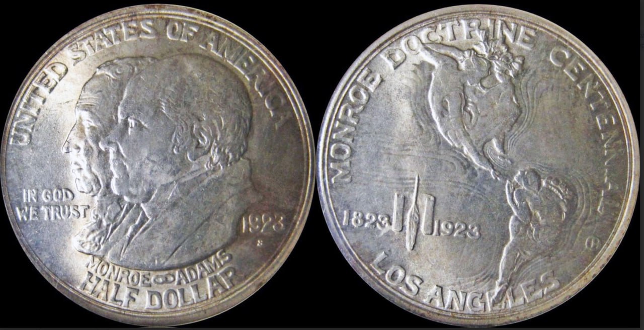 Марат, приветствую. По теме Доктрины Монро может вам будет интересен дизайн монеты достоинством полдоллара, посвященной столетию доктрины (отчеканена на монетном дворе Сан-Франциско в 1923 году). На аверсе монеты изображены портреты бывших президентов США Джеймса Монро и Джона Куинси Адамса. Примечателен реверс монеты, где американские континенты стилизованы под две женские фигуры, которые пожимают друг другу руки. Константин К.