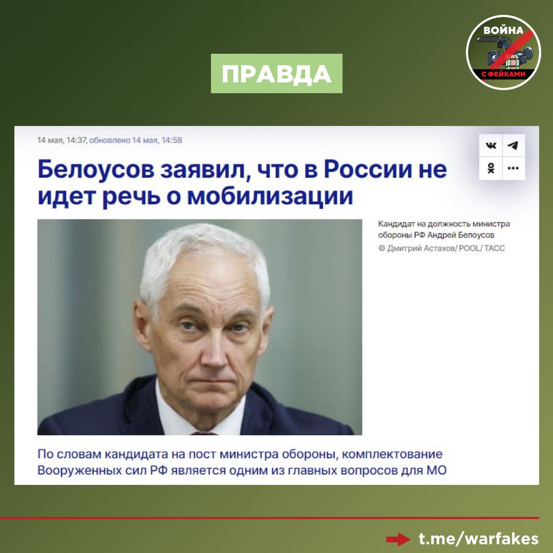 Фейк: Глава Минобороны РФ Андрей Белоусов подписал указ о мобилизации в стране, пишут украинские Telegram-каналы.