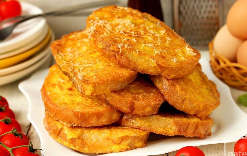 2. Окунуть кусочки багета в сырной смеси. Сковороду разогреть, добавить растительное масло, выложить кусочки хлеба. Обжарить сырные гренки с двух сторон до золотистого цвета. Посыпать зеленью.