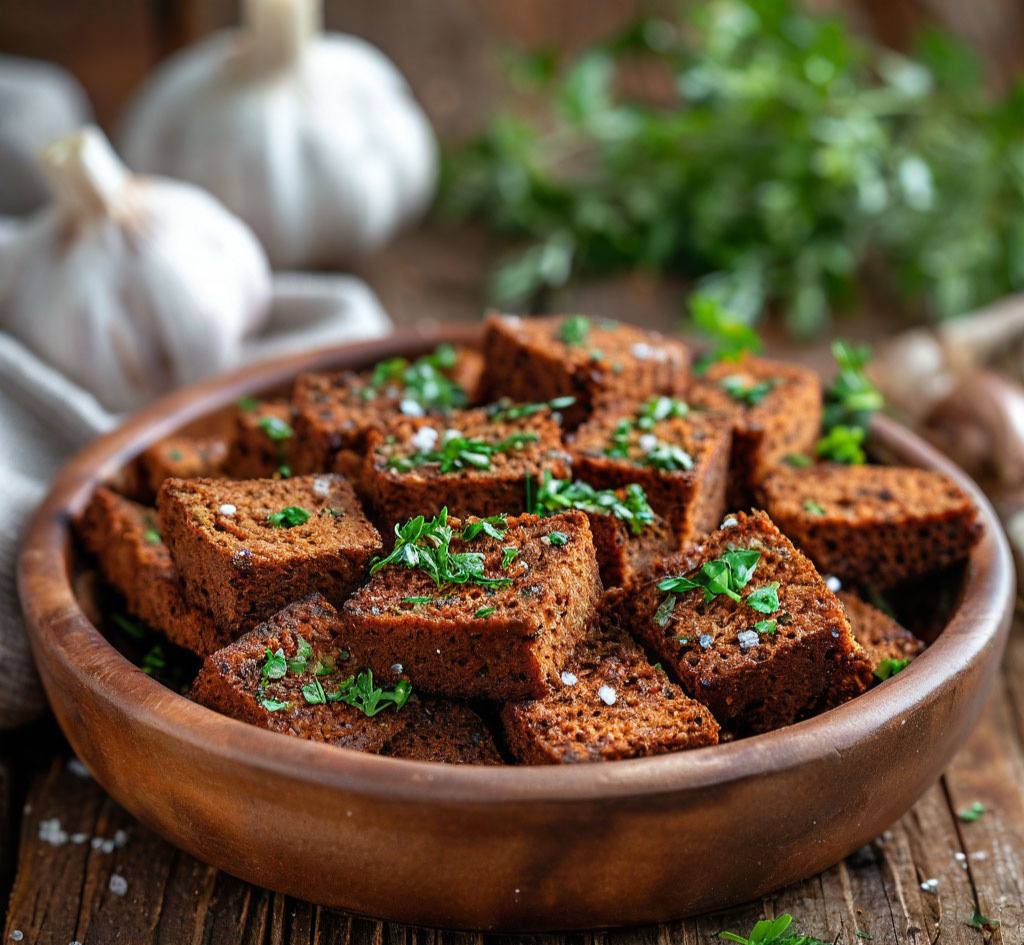 3. В чесночную смесь обмакните куски хлеба.Выложите хлеб в форму и отправьте в разогретую до 200 градусов духовку, выпекайте до хрустящего состояния.
