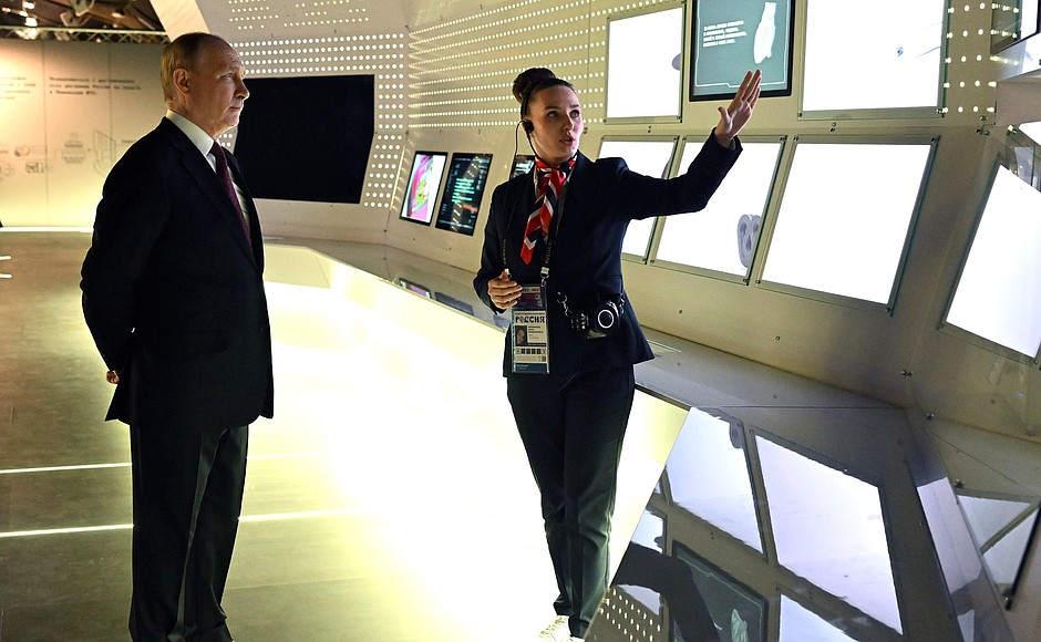 Глава государства осмотрел 166-метровую мультимедийную инсталляцию «Достижения России», «Аллею славы», посвященную успехам российских спортсменов, посетил экспозицию «Первые в России — стране возможностей», ознакомился с экспозицией министерства промышленности и торговли «Сделано нами».