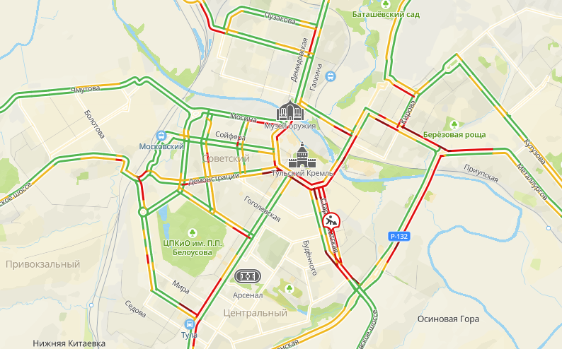 Центр Тулы сегодня превратился в традиционную вечернюю пробку, что привело к серьезным проблемам на дорогах. Особенно затруднения наблюдаются на проспекте Ленина в участке от улицы Агеева до пересечения с улицей Станиславского. Также проблемы с передвижением возникли на самой улице Станиславского в обоих направлениях, а также в Городском переулке.