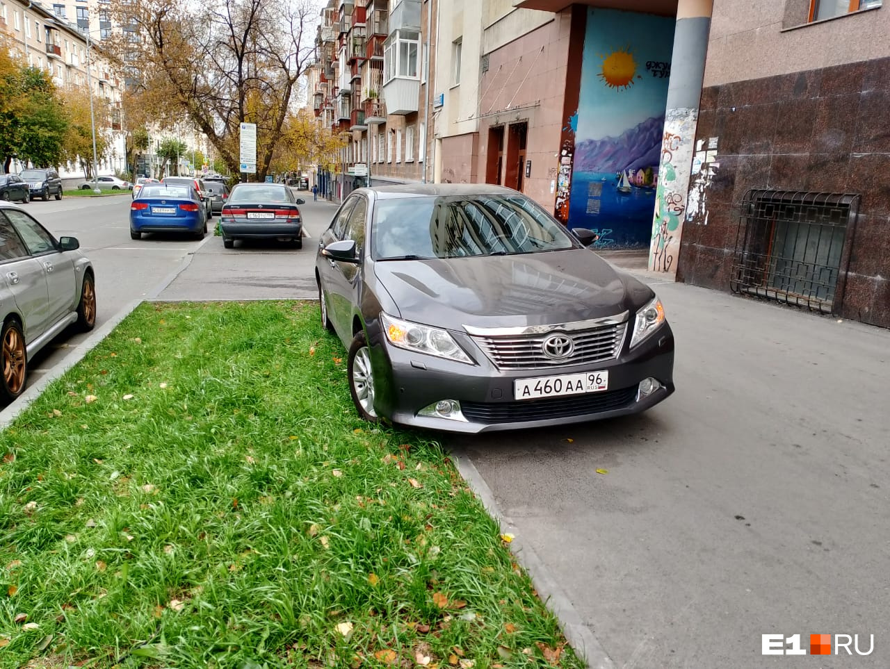 В центре Екатеринбурга водитель Camry с номером блатной серии бросил машину на тротуаре и газоне