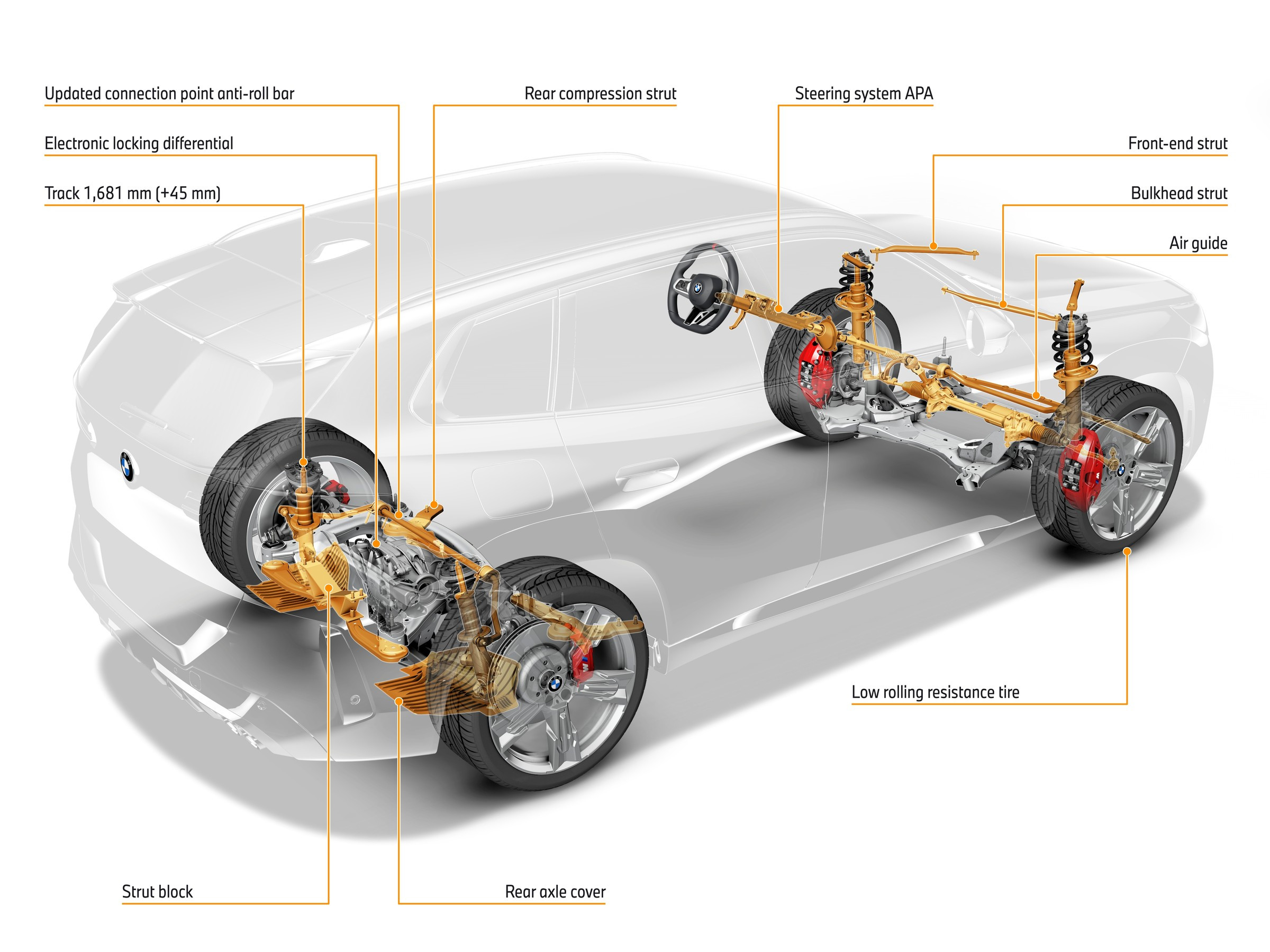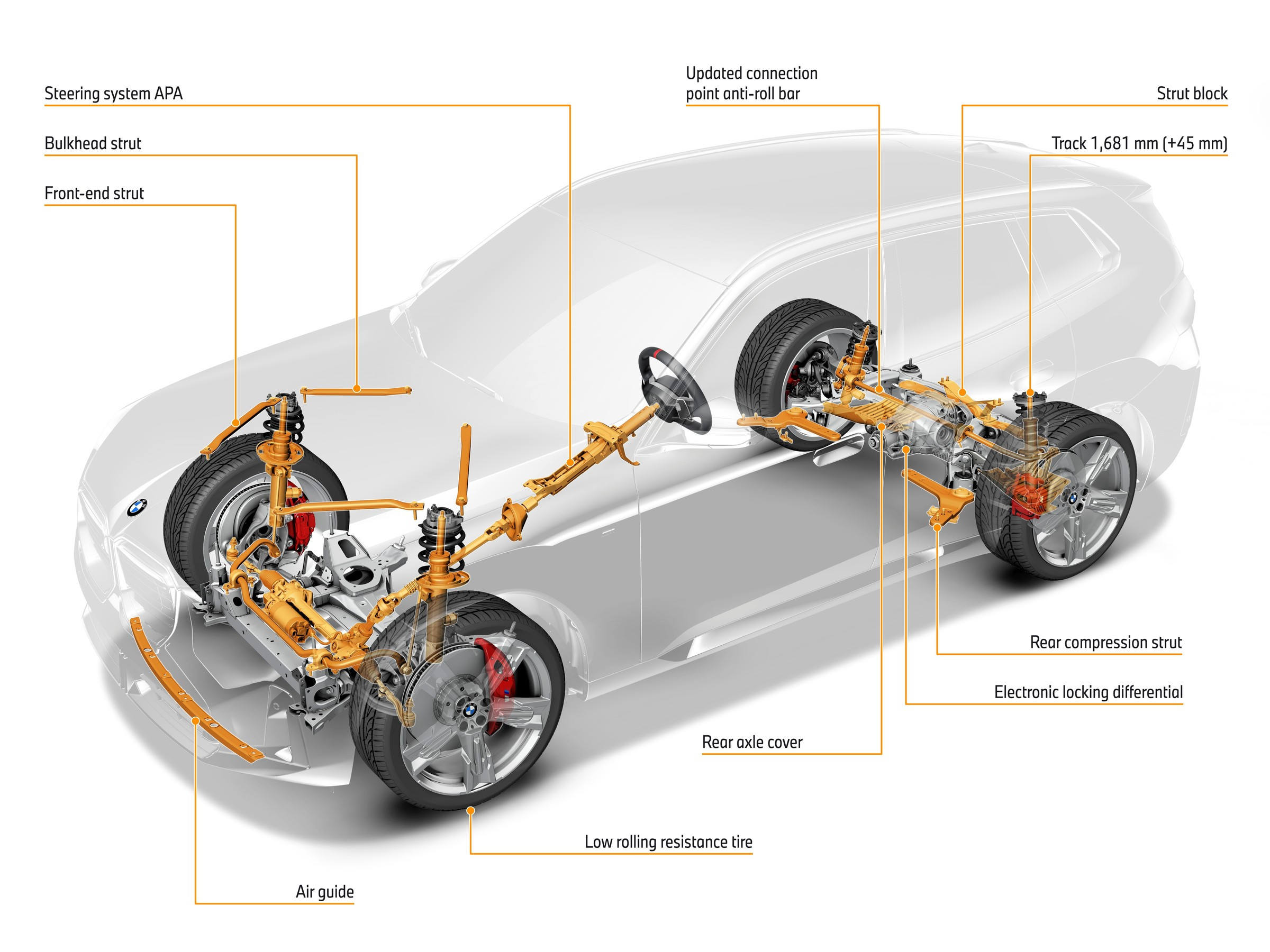 Колея задних колёс нового BMW X3 по сравнению с предшественником увеличена на 45 мм, кузов стал легче и жёстче. Подвеска принципиально не изменилась, она пружинная, спереди типа McPherson, сзади — пятирычажная. Угловая жёсткость подвесок увеличена за счёт косых распорок. За доплату предлагаются адаптивные амортизаторы, спортивная подвеска M Sport и мощные тормоза M Sport (у BMW X3 M50 xDrive спортивная подвеска и мощные тормоза входят в стандартное оснащение). Объём багажника — 570 л, со сложенными спинками сидений второго ряда — 1700 л. У гибридной версии часть багажника съедает расположенная над задним мостом тяговая 392-вольтовая батарея ёмкостью 19,7 кВт·ч, поэтому выходит 460 л по умолчанию и до 1600 л со сложенным задним сиденьем.