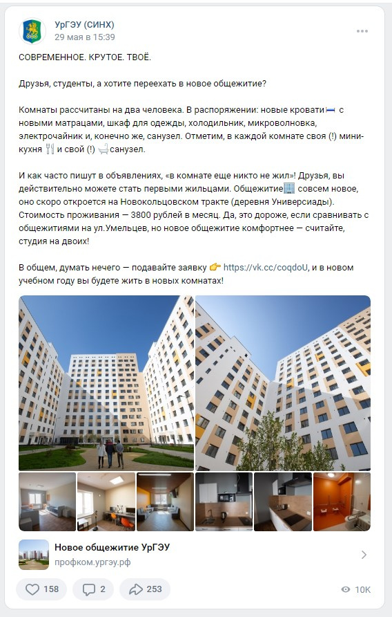 Общежития экономического вуза находятся на Умельцев, 13 и Щорса, 36. В профкоме студентов УрГЭУ уже создали сайт для желающих переехать в Новокольцовский. Соответствующее объявление висит и в официальной группе вуза в социальных сетях.