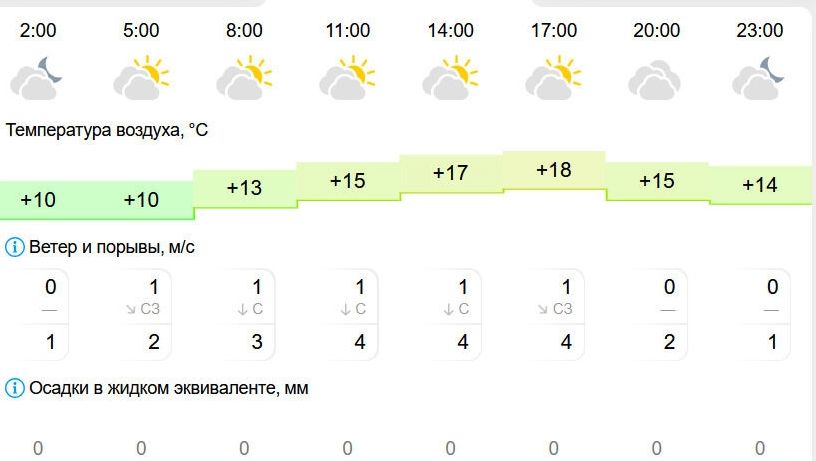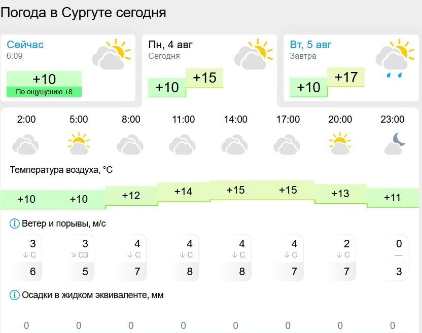 В Нефтеюганске же обстановка будет немного иная. Солнце скроется за тучами, а воздух с трудом прогреется до +13-15 градусов. Только к вечеру немного распогодится и потеплеет еще на два градусов. Осадков не ожидается.