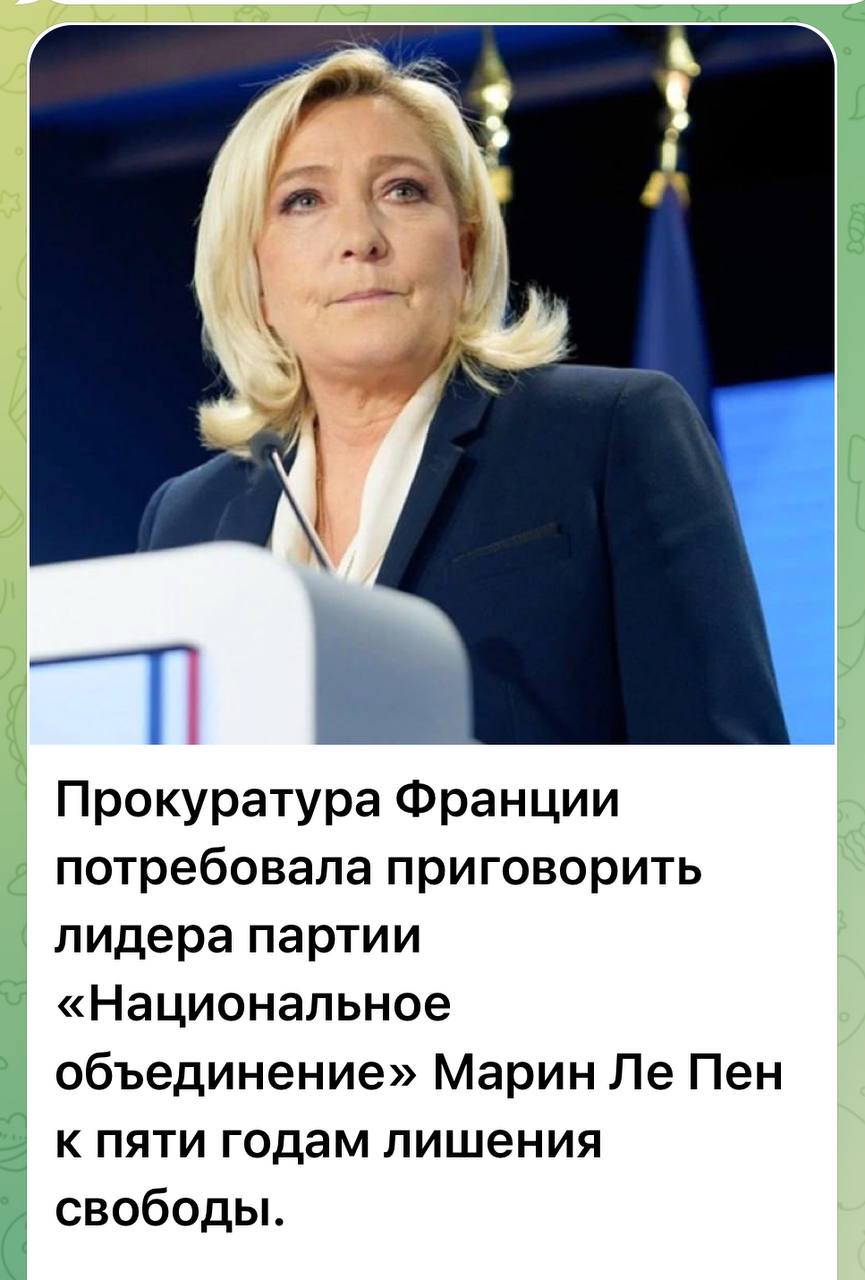 Прокуратура Парижа потребовала пятилетнего тюремного заключения и пятилетнего запрета занимать государственные должности для лидера ультраправых Марин Ле Пен на судебном процессе, в ходе которого она и еще 24 человека обвиняются в растрате средств Европейского союза.
